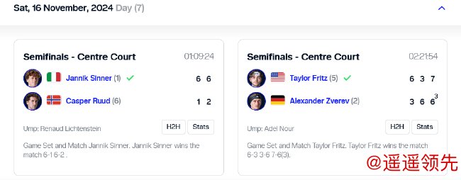 北京时间11月17日凌晨,2024ATP年终总决赛第七日战罢。在2场男单半决赛中,头号种子辛纳2-0战胜6号种子鲁德,5号种子弗里茨2-1力克2号种子A-兹维列夫开云体育线上网站,双双晋级决赛;男双方面,头号种子、世界排名第一的阿雷瓦罗/帕维奇将和8号种子、德国组合克拉维茨/普埃茨争冠。