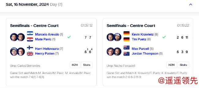 随后的第二场半决赛中,头号种子、世界第一组合阿雷瓦洛/帕维奇用时1小时37分钟,通过2个抢七,以7-6(1)/7-6(4)击败7号种子、温网冠军帕滕/赫利奥瓦拉,闯入决赛,将与德国组合克拉维茨/普埃茨争冠。