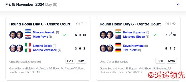 随后,在本组最后一场比赛开始之前,头号种子阿雷瓦洛/帕维奇组合荣膺2024ATP年终双打第一。这对组合在本赛季拿到了法网、辛辛那提、香港、日内瓦4项赛事冠军,此前战绩达到45胜19负。